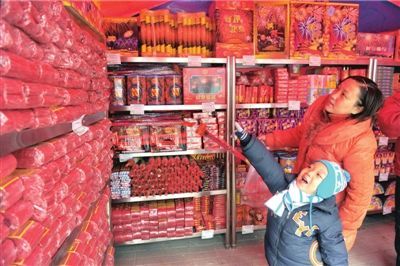 | 簡文:1石景山魯谷市場門前的煙花爆竹攤點內(nèi),一位母親帶著孩子在選購煙花爆竹。 本報記者胡雪柏攝
