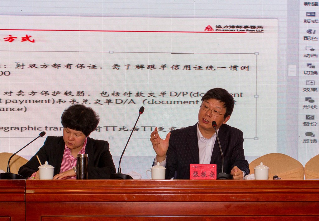 法律服務中心邀請了上海協(xié)力律師事務所的高級合伙人張振安律師(國內(nèi)知名訴訟律師、多個仲裁機構仲裁員)講解“國際貿(mào)易法律實務與風險防控”。張律師結合自身從業(yè)經(jīng)驗,深入淺出地對國際貿(mào)易過程中應當注意的問題、如締約形式、締約內(nèi)容、結算方式、爭議解決等方面進行了重點闡述和操作提示,使花炮企業(yè)尤其是出口企業(yè)和外貿(mào)企業(yè)受益匪淺。