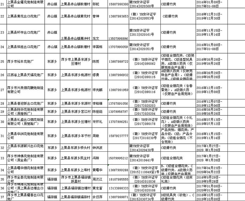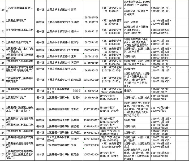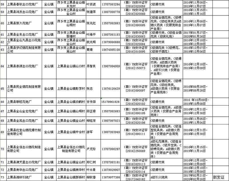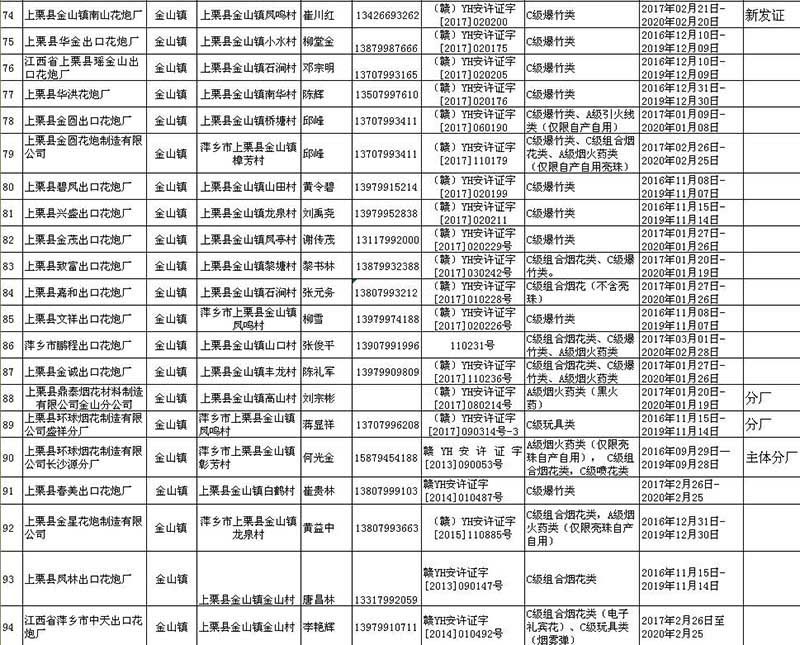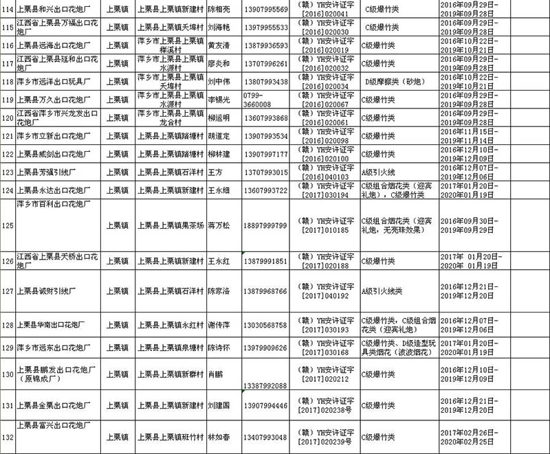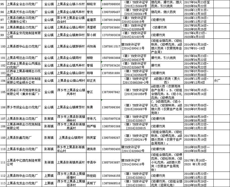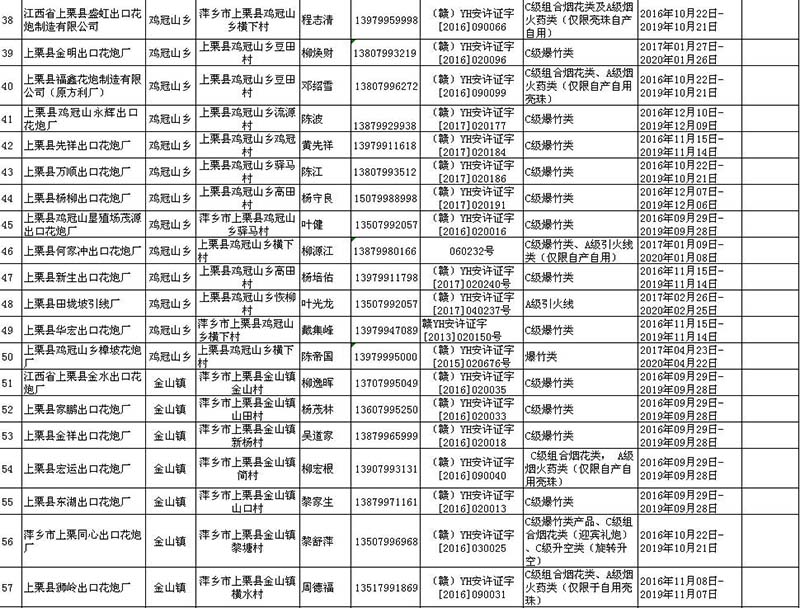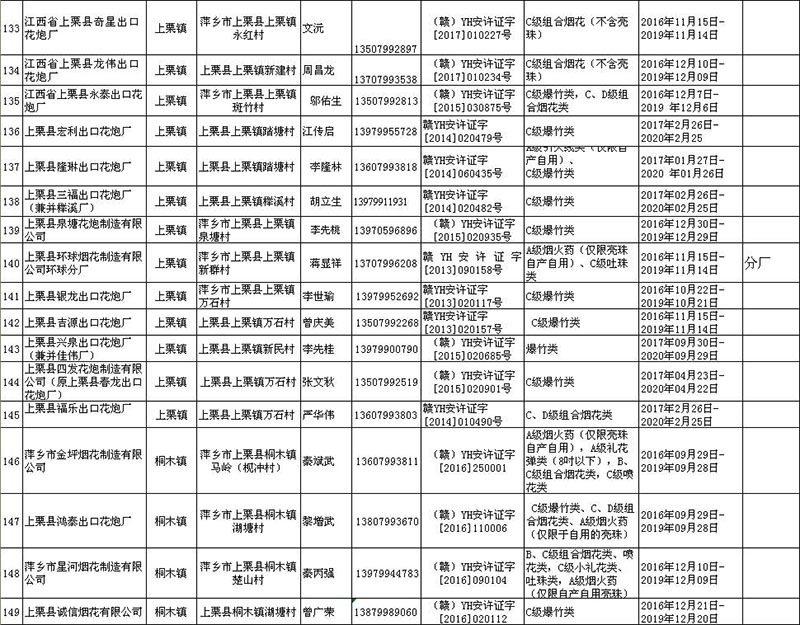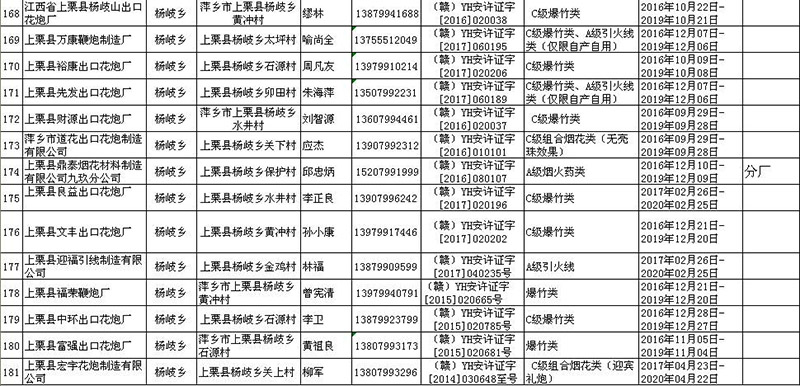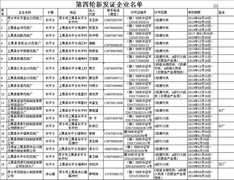 第四輪已發(fā)證181家(含8家分廠),其中長平鄉(xiāng)19家和3家分廠,赤山鎮(zhèn)5家,東源鄉(xiāng)10家,福田鎮(zhèn)3家,雞冠山鄉(xiāng)13家,金山鎮(zhèn)56家和3家分廠,彭高鎮(zhèn)5家,上栗鎮(zhèn)34家和1家分廠,桐木鎮(zhèn)22家,楊岐鄉(xiāng)14家和1家分廠。兼并及集團化企業(yè)15家(金泰一分廠、利興廠、吉祥星廠、成貴廠、光輝廠、喜慶廠、祥旺、宇源、金榜、長祥、凌云、長沙源、盛祥、興志、五星、長福、四發(fā))。新發(fā)證企業(yè)2家(湘林、南山)