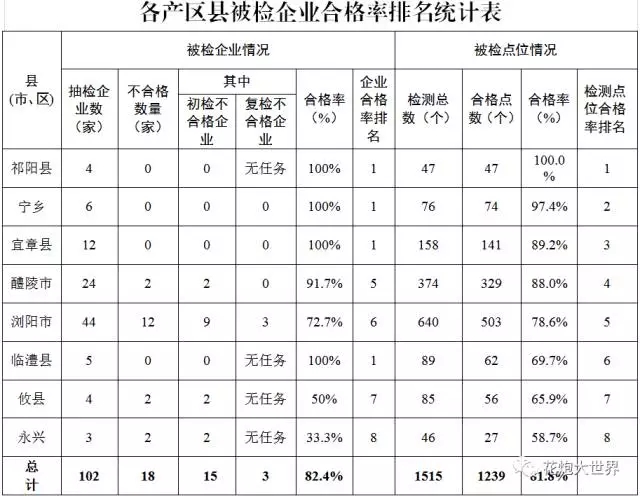 本次抽檢對象點位平均合格率為81.8%,較2016年國家抽檢合格率(63.6%)提高了近20個點,其中被檢的爆竹裝藥機合格率達到100%,被檢黑火藥、引火線企業(yè)裸藥加工機械均合格率達80%以上,祁陽縣、寧鄉(xiāng)市、宜章縣、醴陵市被檢企業(yè)點位合格率高于平均合格率。