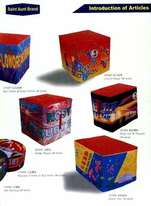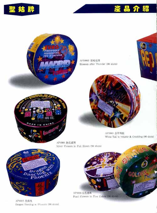 我廠生產(chǎn)的圣姑牌禮花,分為吐珠類、組合煙花,旋轉(zhuǎn)噴花升空類,1.5寸-16寸禮花彈,大盤花組合等在中型產(chǎn)品500多種,工藝獨(dú)特、造型新穎、色彩鮮艷,響聲清脆,叫聲悅耳,裝璜美觀,產(chǎn)品遠(yuǎn)銷美國、日本、英國、西班牙、挪威、比利時(shí)、瑞士、荷蘭、臺灣、香港等二十多個(gè)國家和地區(qū),深受廣大消費(fèi)者的喜愛和信賴,年銷售出口量七萬多箱,是中國大型煙花之首,在國內(nèi)外享有很高的聲譽(yù)。