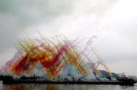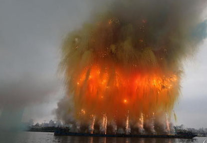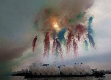 2014年8月8日,“蔡國強:九級浪”展覽正式在上海當代藝術博物館開幕,開幕式后,蔡國強在上海黃浦江面上,為上海市民獻上他在國內的首件“白天焰火”作品。蔡國強在上海的作品白日焰火引發(fā)部分市民關注,上海市公安局8日下午在微博上表示:“蜀黍看見后也嚇了一跳!鄙虾>匠吻,據巡邏民警反饋,17時05分許,黃浦江上進行了一場“白日煙彩”煙火創(chuàng)作表演,放了大約10分鐘,產生了大量煙霧。