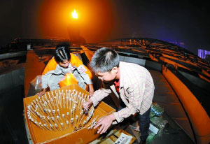 昨日凌晨3時(shí),在主火炬的照耀下,工人在鳥(niǎo)巢頂安放閉幕式煙花。本報(bào)記者 陳杰 攝