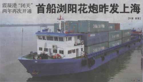 據(jù)介紹,長沙霞凝港是直通上海港口的內(nèi)陸港。自2006年5月份,該港口因集裝箱爆炸,對花炮運輸說“不”以后,瀏陽花炮主要經(jīng)武漢港口中轉(zhuǎn)至上海,但是由于陸路運輸距離較長,加上港口駁船緊張,運輸費直往上升,一個發(fā)往歐洲的柜,運費最高的時候己經(jīng)達到10多萬元。