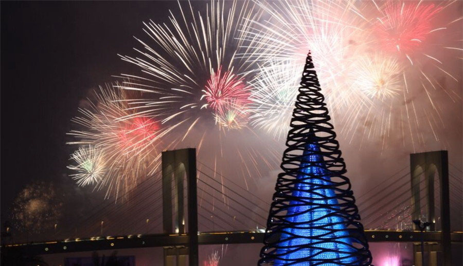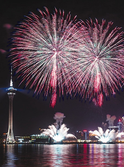 2014年12月20日,中國澳門,澳門舉行盛大煙花表演慶祝特區(qū)成立15周年,祝福澳門興盛繁榮。五彩繽紛絢麗煙花綻放在海面,與澳門半島、氹仔島五光十色的霓虹燈遙相呼應(yīng)。