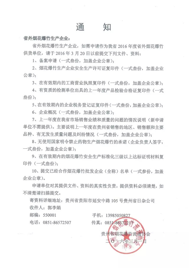 上一篇 ↑[河南省煙花爆竹安全工作會議暨產銷洽談會昨日在鄭舉行] 下一篇 ↓[關于召開四川省煙花爆竹協(xié)會第一屆三次會員大會暨2016年煙花爆竹產品推介會的通知7號]