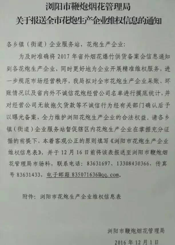 各鄉(xiāng)鎮(zhèn)(街道)企業(yè)服務(wù)站,花炮生產(chǎn)企業(yè):為及時(shí)準(zhǔn)確將2017年省外煙花爆竹供貨備案會(huì)信息通知到各花炮生產(chǎn)企業(yè),同時(shí)更好的為企業(yè)開(kāi)展精準(zhǔn)維權(quán)服務(wù),進(jìn)一步規(guī)范市場(chǎng)經(jīng)營(yíng)秩序,我局?jǐn)M對(duì)全市花炮生產(chǎn)企業(yè)呆賬、壞賬情況以及省內(nèi)外不誠(chéng)信花炮經(jīng)營(yíng)公司名單進(jìn)行摸底統(tǒng)計(jì),并對(duì)經(jīng)營(yíng)公司無(wú)故拖欠貨款等不誠(chéng)信行為經(jīng)有關(guān)部門確認(rèn)后予以曝光備案,全力維護(hù)瀏陽(yáng)花炮生產(chǎn)企業(yè)的合法權(quán)益。