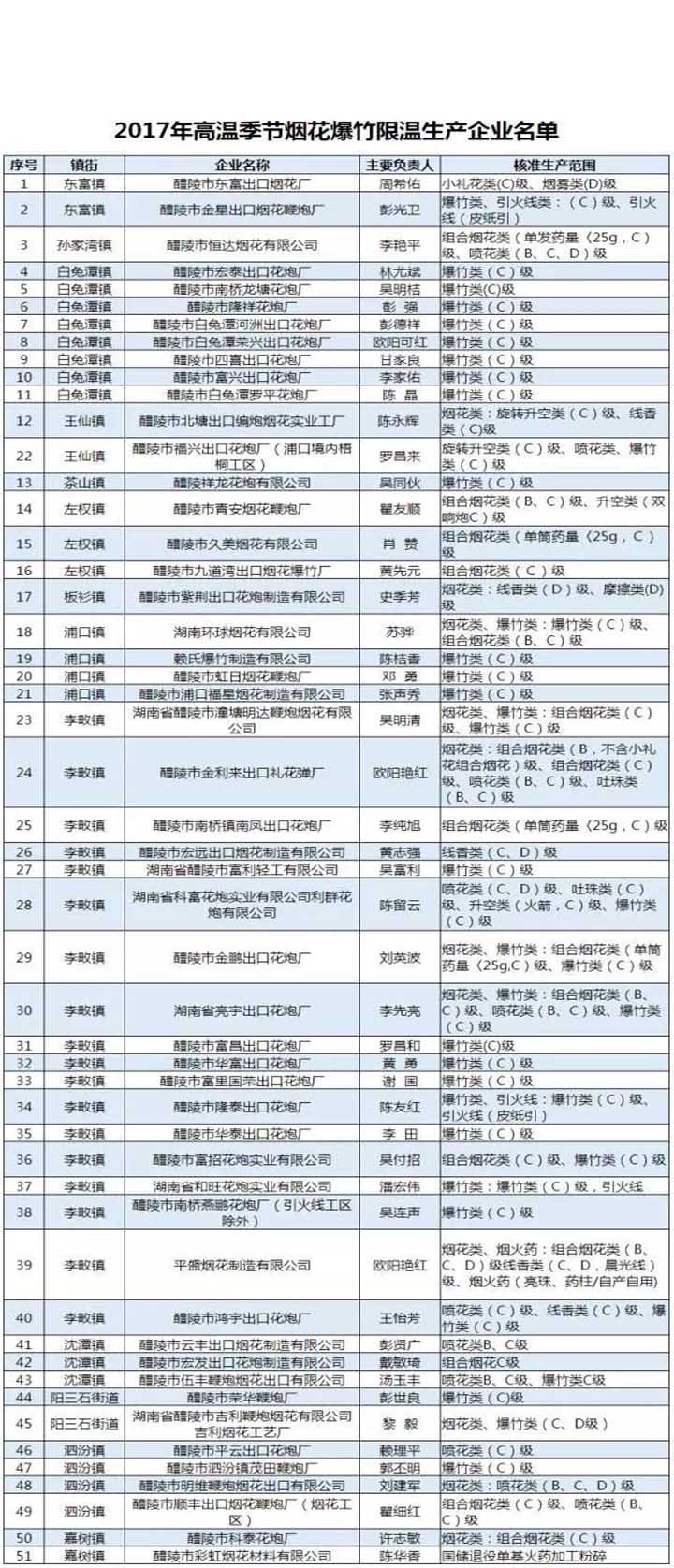 我市有51家煙花爆竹企業(yè)允許高溫季節(jié)生產(chǎn)到8月1日。名單如下: