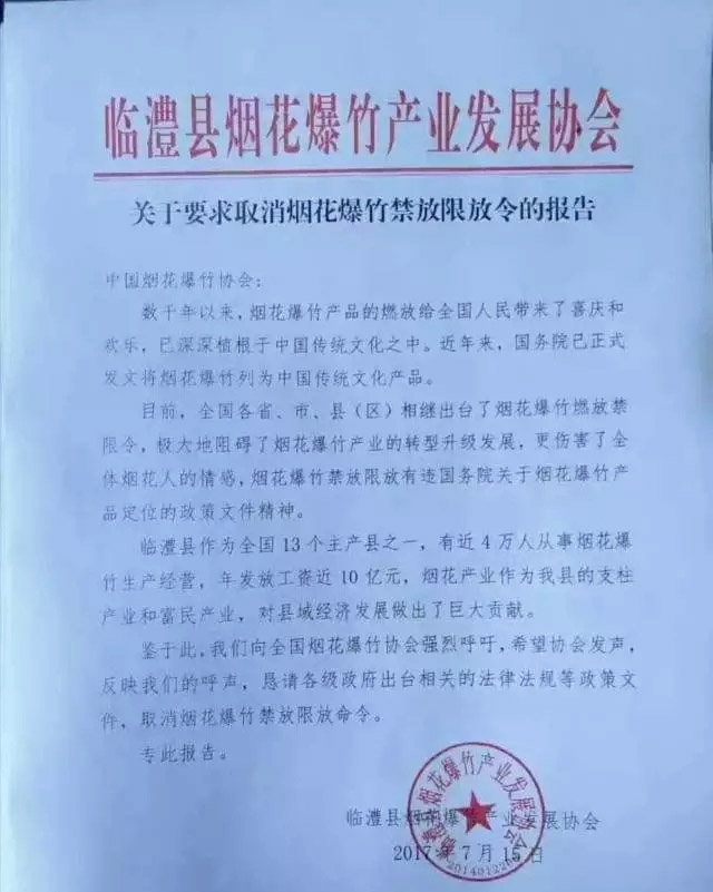 常德臨澧縣煙花爆竹產(chǎn)業(yè)發(fā)展協(xié)會(huì)關(guān)于要求取消煙花爆竹禁放限令的報(bào)告