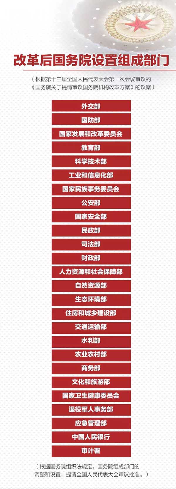 改革后,除國務(wù)院辦公廳外,國務(wù)院設(shè)置組成部門26個。