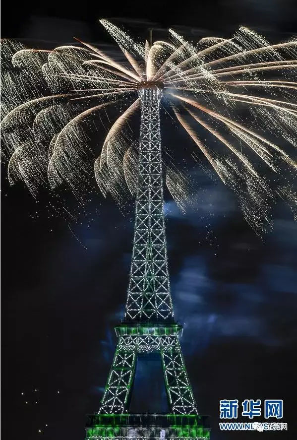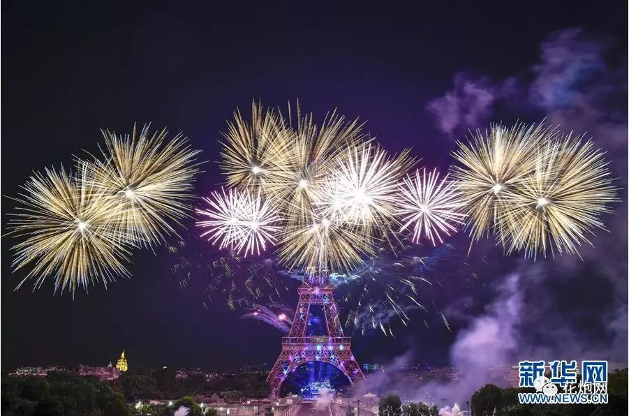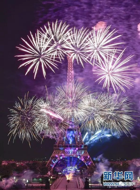 7月14日,在法國巴黎,慶祝國慶日的煙花在埃菲爾鐵塔附近綻放。