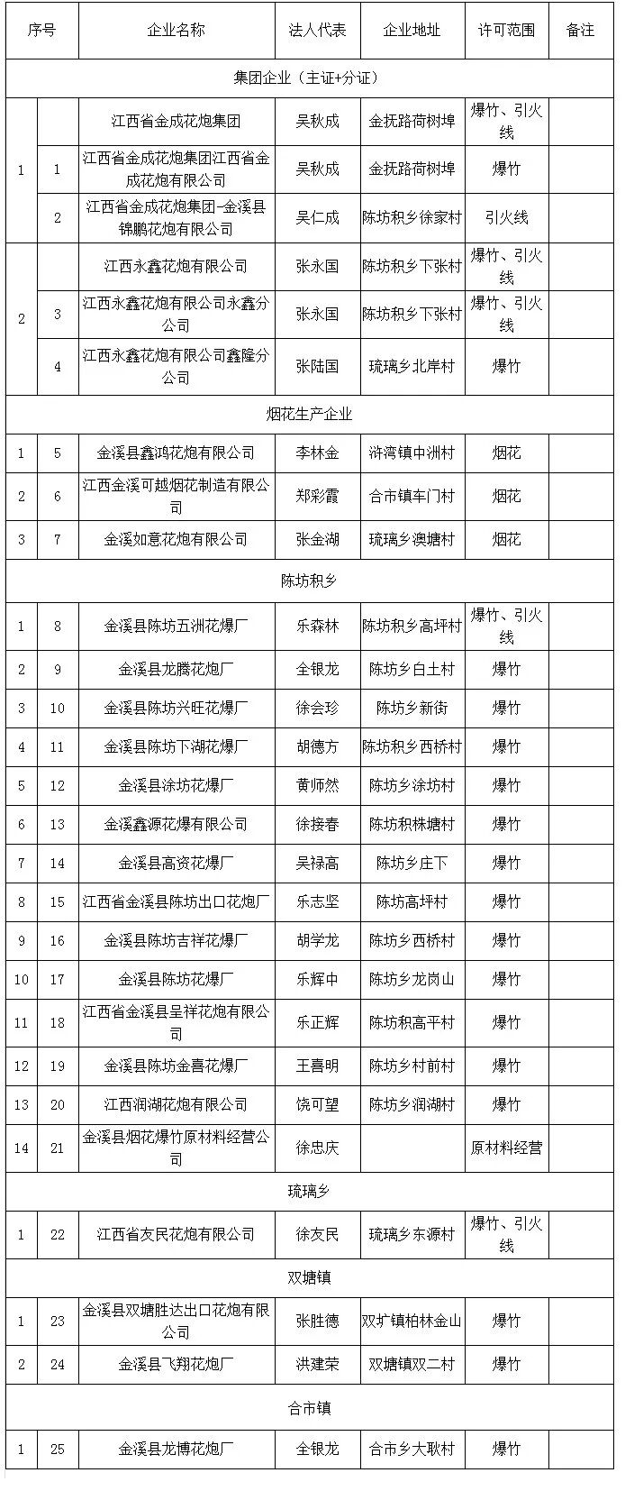截止2018年10月25日,金溪縣自愿申請退出煙花爆竹生產(chǎn)企業(yè)共25家,現(xiàn)將25家生產(chǎn)企業(yè)名單公示如下:
