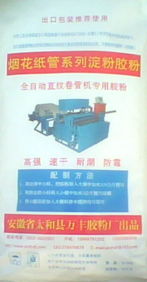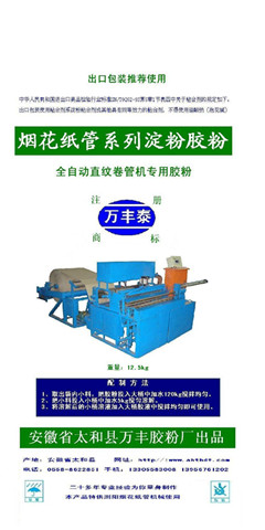 紙管專用膠可供各類紙管機械卷管用,取代玻璃膠、白乳膠、聚乙烯醇類的各種紙管膠,價格僅是其他紙管膠的一半左右,該膠初粘快,干燥迅速。用該膠粘合成型的紙管硬度、強度明顯高于用白乳膠,聚乙烯醇膠等其他管膠所粘合的紙管。而且耐潮性好,完全能滿足各種紙管耐潮性的要求,是目前國內質優(yōu)價廉性、性價比一流的紙管專用膠。用該膠不僅能明顯提高紙管的強度,又能大大降低成本. 瀏陽市誠信淀粉膠專營 地址:瀏陽市花炮大市場三區(qū)七棟166號 手機:15802532098 聯(lián)系人:李經理