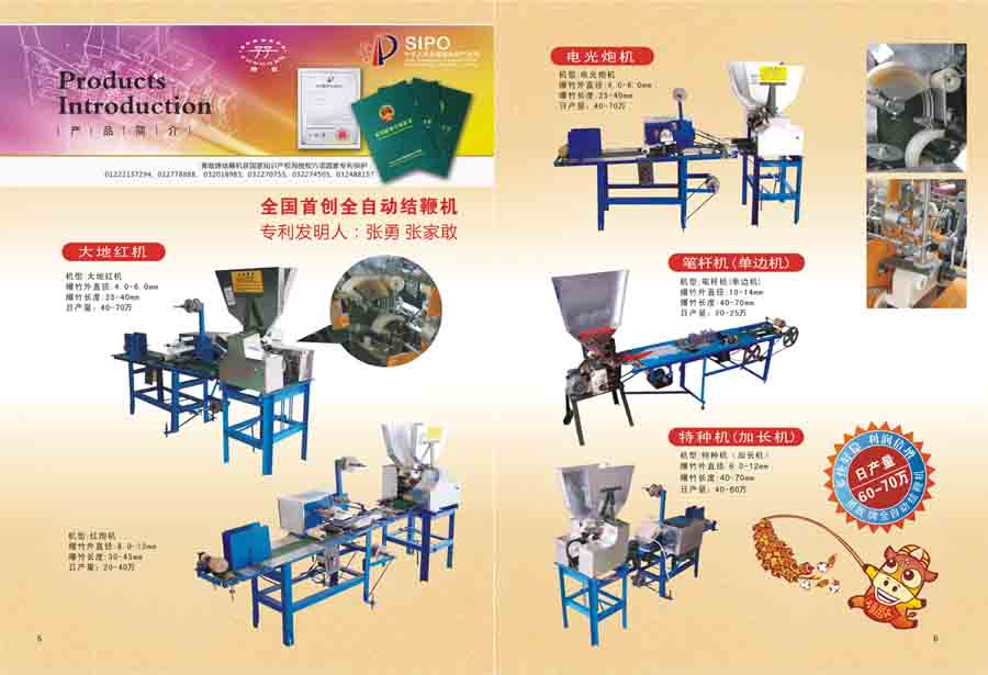 醴陵市勇敢機(jī)械有限公司,為解決廣大鞭炮生產(chǎn)廠家插引效率低,人員難找的難題,公司從2010年起,組織了強(qiáng)大的研發(fā)團(tuán)隊(duì),開始了全自動(dòng)插引機(jī)的研發(fā)。經(jīng)過2年的研發(fā)、和市場應(yīng)用試驗(yàn)現(xiàn)已取圓滿成功。