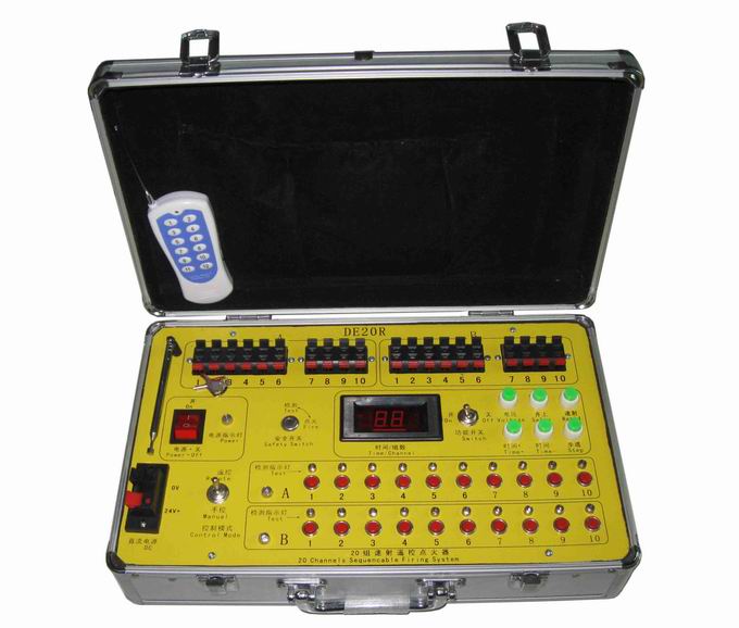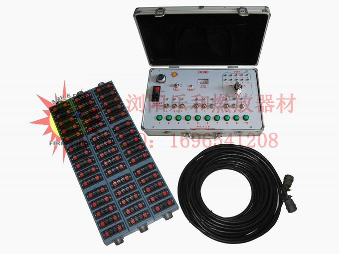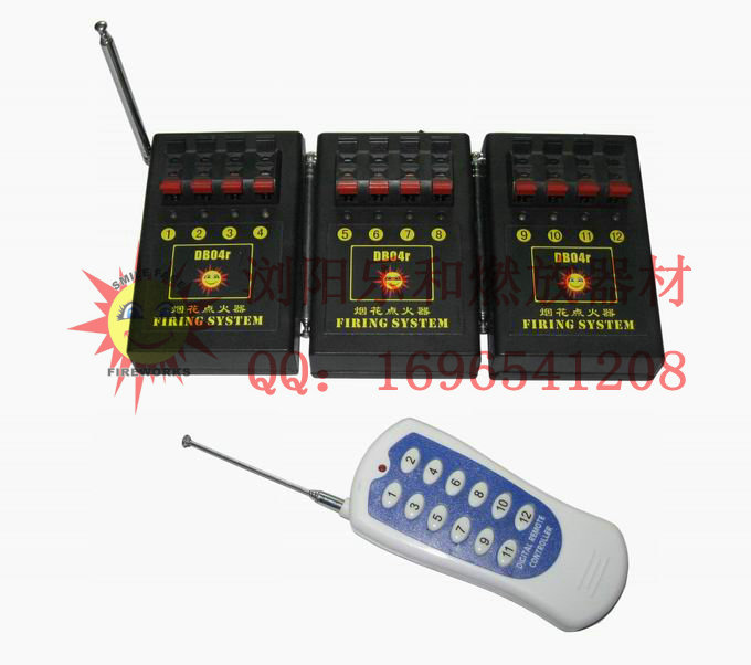 一控八組,產(chǎn)品包括:2小遙控(12鍵的大遙控器)、8個1組接收盒,其中接收盒裝4節(jié)5號電池,不含電池價格,每組可以串接4-5個電點火頭,可以對碼操作,